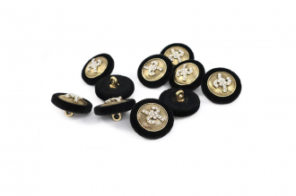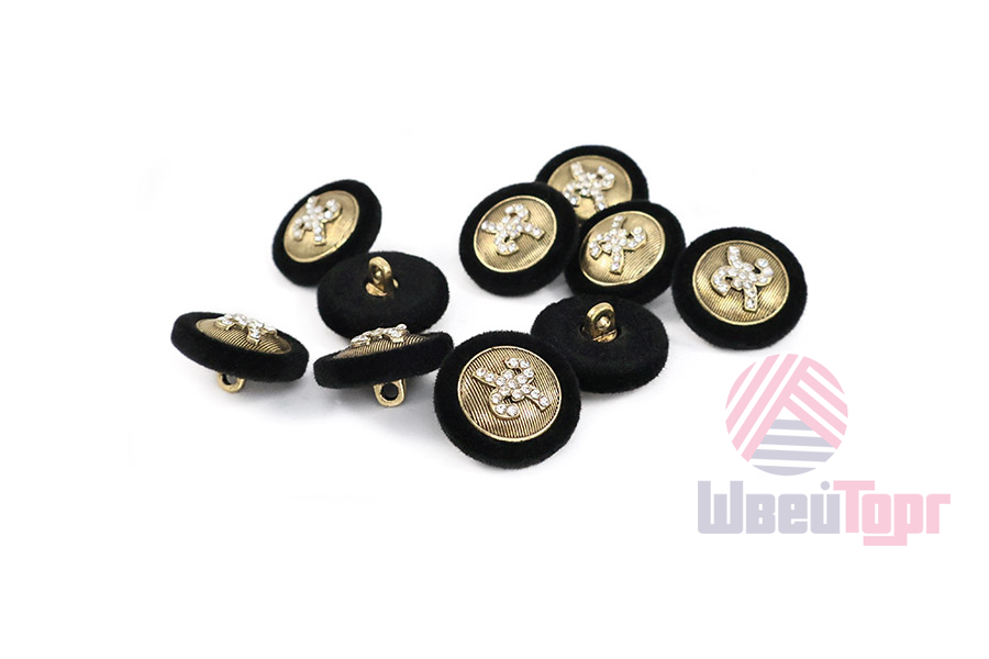 Прекрасная деталь для ваших костюмов и жакетов – эта пуговица сочетает в себе сдержанную роскошь и оригинальный дизайн. Её основа, выполненная из металла, покрыта тактильно приятной бархатной фактурой глубокого чёрного цвета, которая эффектно контрастирует с золотистой "сердцевиной". Центр украшает объёмный декоративный элемент, усыпанный мелкими стразами, – он завораживающе искрится и играет бликами при любом освещении, добавляя образу изысканности и индивидуальности.