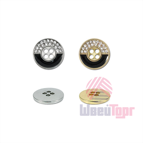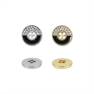 Эта классическая круглая пуговица на четыре прокола легко и надёжно пришивается, идеально подходя для рубашек и стильных блуз. Её оригинальный дизайн привлекает внимание контрастным разделением лицевой стороны: одна половина сияет россыпью мелких стразов, а другая – выполнена в гладком глянцевом чёрном цвете, создавая эффектную и сбалансированную деталь.