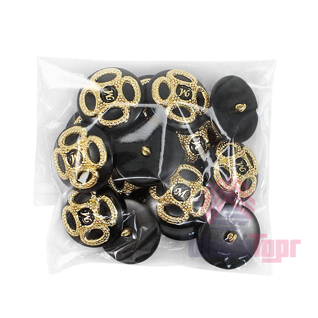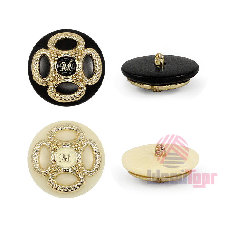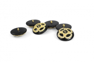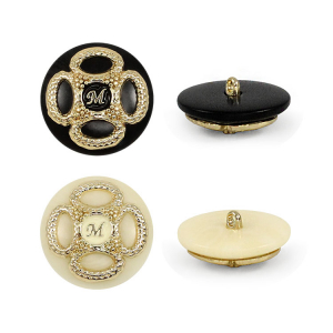 Пластиковая пуговица на ножке с шикарным золотым декором. В центре – буква «M» в обрамлении симметричного позолоченного узора. Доступна в двух классических сочетаниях: крем с золотом и чёрный с золотом. Яркий акцент для создания смелого образа.