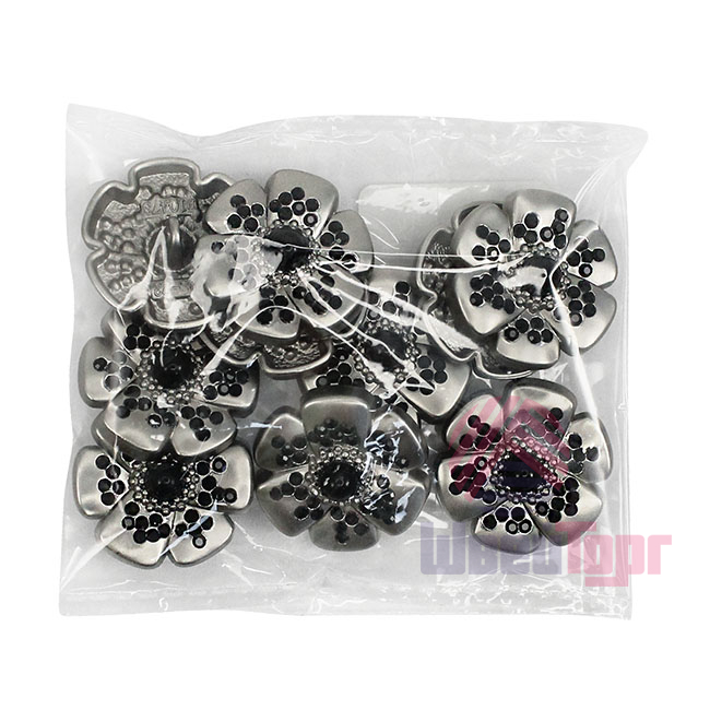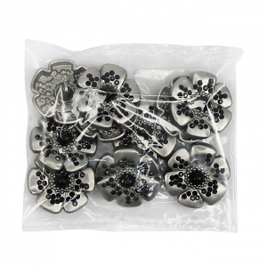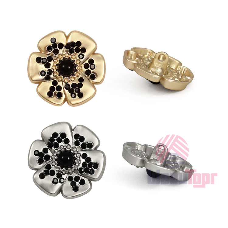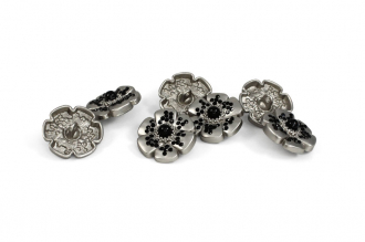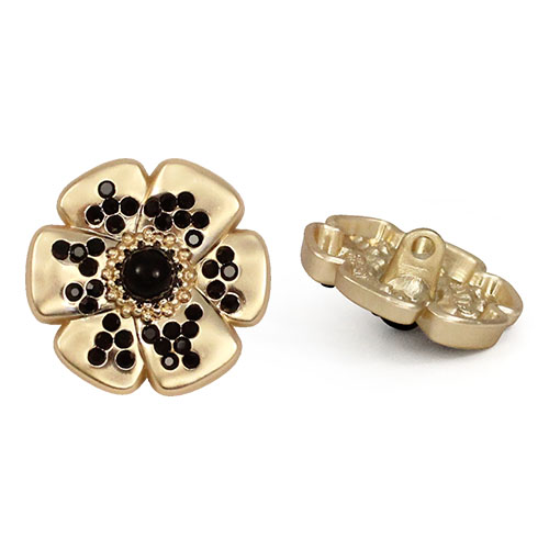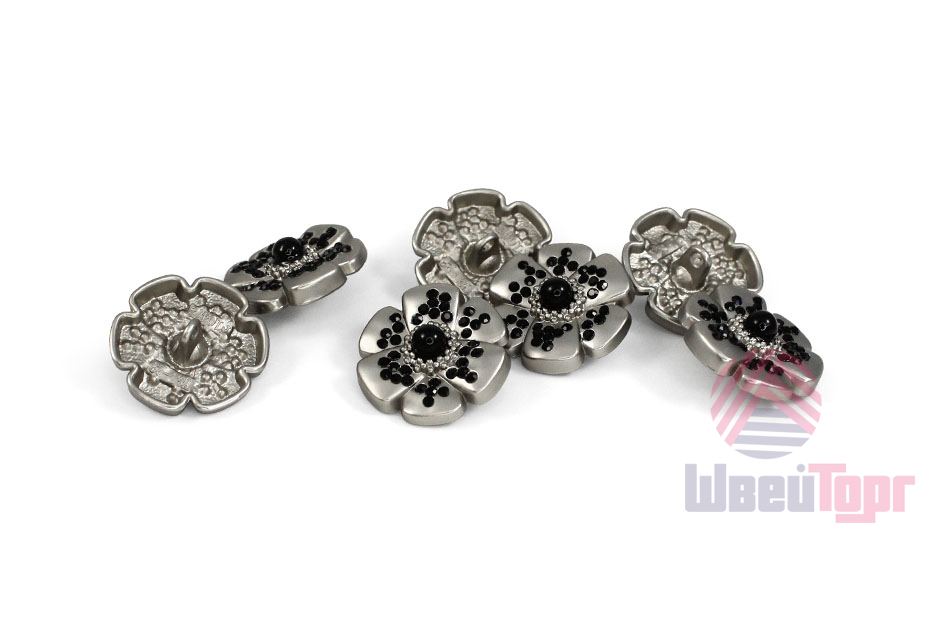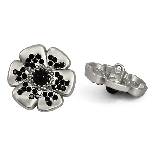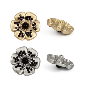 Эта металлическая пуговица на ножке, выполненная в форме цветка с контрастными чёрными стразами, станет стильным акцентом для ваших изделий. Пуговицы представлены в базовых цветах – матовое серебро и матовое золото, оба варианта отлично сочетаются с контрастным чёрным декором. Эти пуговицы великолепно украсят костюм или жакет.