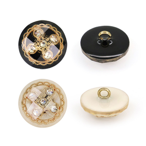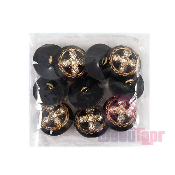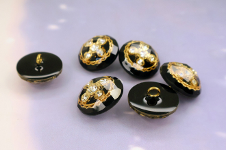 Внутри прозрачной акриловой полусферы с красивыми гранями скрывается настоящее сокровище — композиция из пяти искрящихся страз. Камни заключены в изящное обрамление: тонкое золотое кольцо с филигранным орнаментом, что придает пуговице особую драгоценную эстетику.