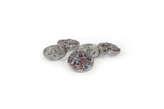 Позвольте вашему наряду расцвести! Эта металлическая пуговица напоминает драгоценную миниатюру. Её сложный, резной дизайн завораживает: основа из серебристого металла подобно кружевной ленте обрамляет нежный букет. Ажурная резьба, образующая букет из голубых и пурпурных соцветий, и лёгкое сияние блёсток делают их маленьким шедевром.