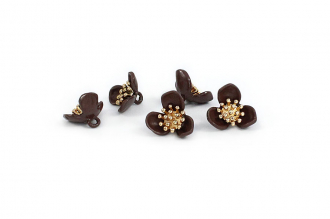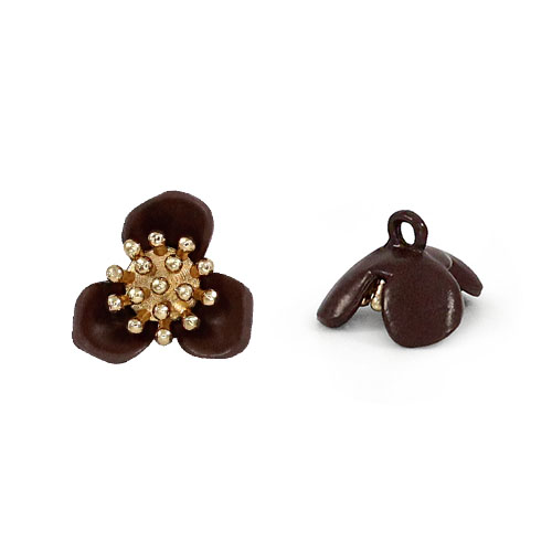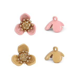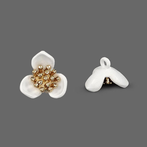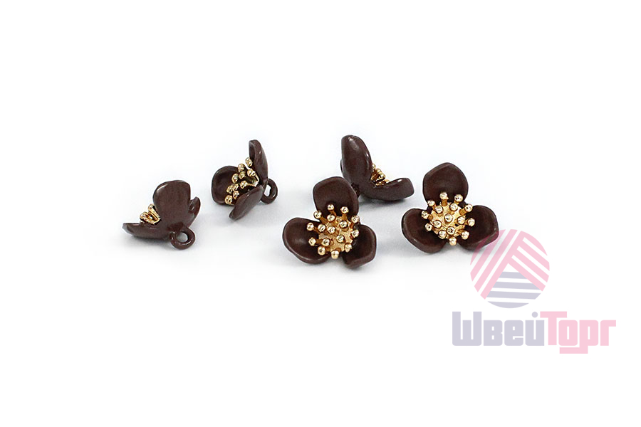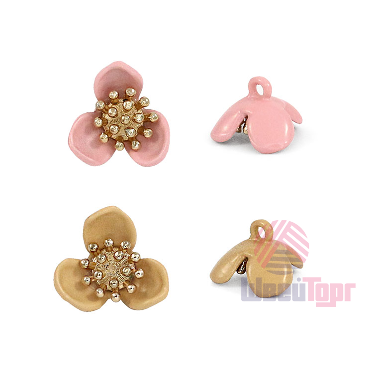 Эта металлическая пуговица на ножке, выполненная в оригинальной форме трёхлепесткового цветка с золотистыми тычинками, станет стильным и контрастным акцентом для ваших изделий. Благодаря насыщенной палитре из пяти цветов – чёрного, белого, абрикосового, розового и кофейного, которые идеально сочетаются с ярким золотом, эти пуговицы великолепно украсят детскую одежду, рубашки, а также добавят изюминку некоторым видам костюмов.