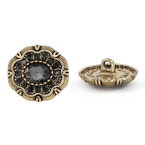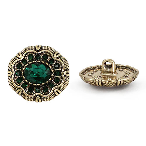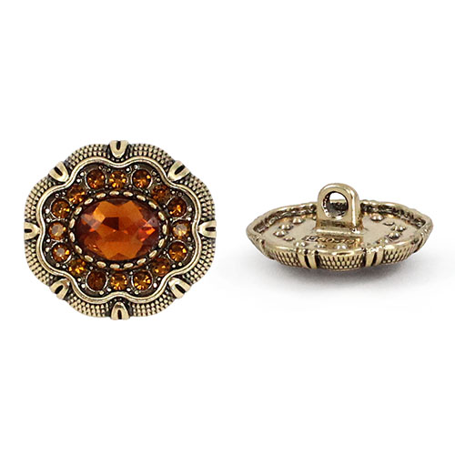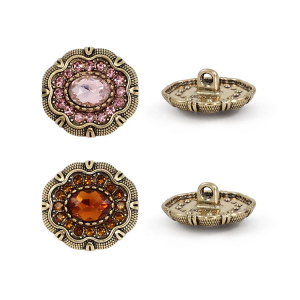 Эта пуговица на ножке станет изысканным завершающим штрихом для вашего изделия. Металлическая основа оттенка «тёмное золото» служит изящной оправой для роскошной композиции: в центре сияет крупная гранёная бусина, имитирующая драгоценный камень, а её блеск многократно усиливается за счёт ореола из мелких сверкающих стразов. Идеальный выбор для вечерних жакетов и костюмов, она представлена в пяти богатых расцветках: топаз, зелёный, розовый, кофе и чёрный.