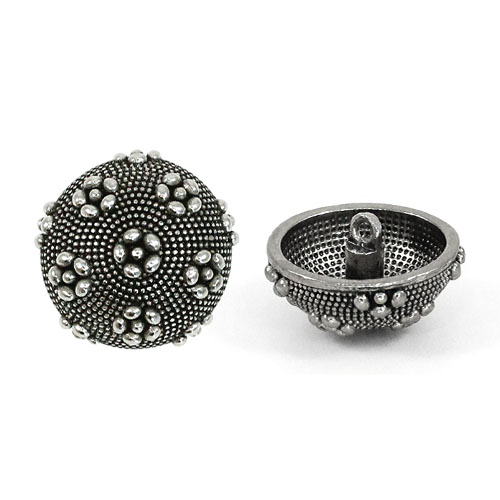 Металлическая пуговица на ножке, диаметр 22 мм, выпуклая форма. У пуговицы оригинальная форма и дизайн - фактурная поверхность, украшенная стилизованными цветками из шариков.