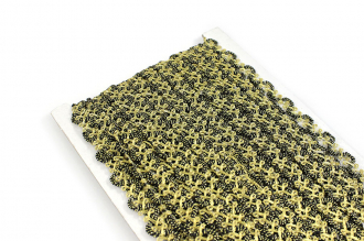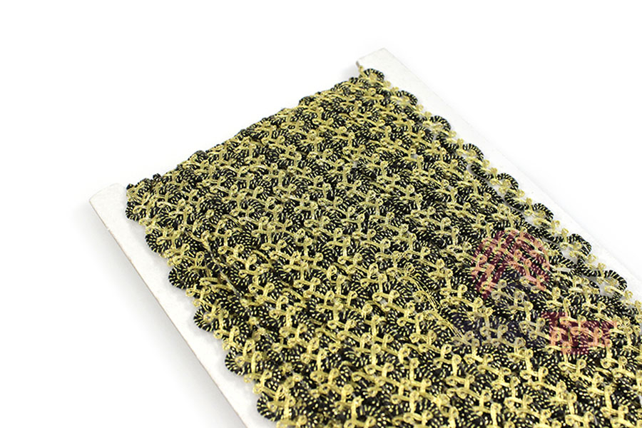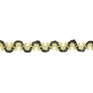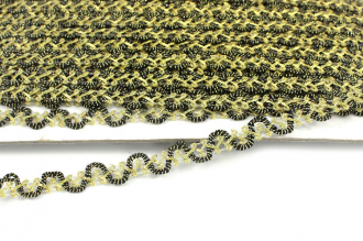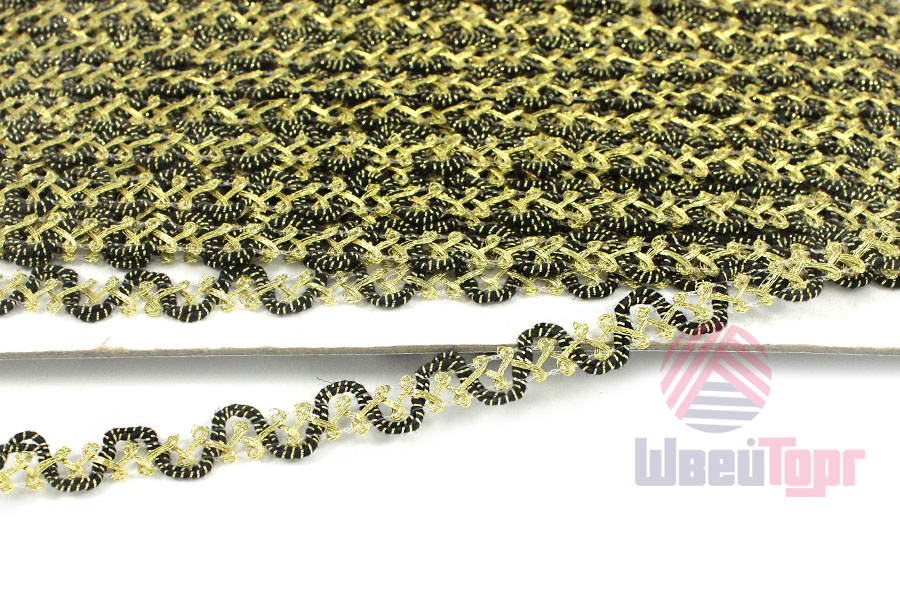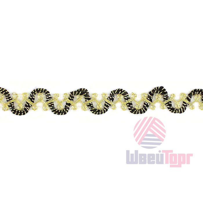 Тесьма доступна в чёрно-золотой расцветке. Она идеально подходит для отделки одежды, декора сценических костюмов, а также для украшения головных уборов и элементов интерьера. Представляет собой прочную плетёную, рельефную тесьму с повторяющимся геометрическим узором. Тесьма пронизана металлизированными нитями, что придаёт ей уникальный блеск. Создавайте свои неповторимые изделия!